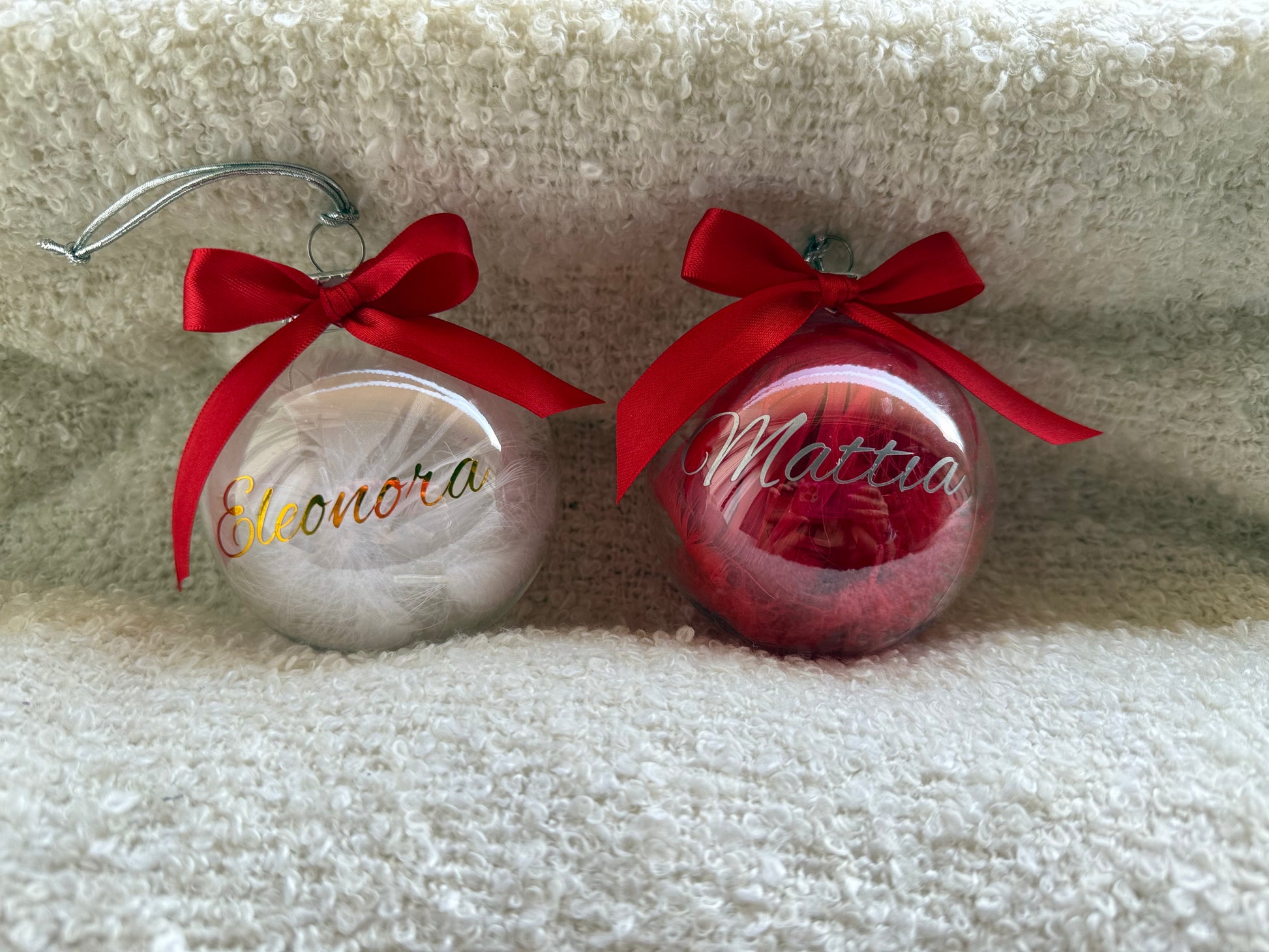 Pallina di Natale in plex personalizzato con nome, all'interno vengono inserite piume a scelta fra due colori.